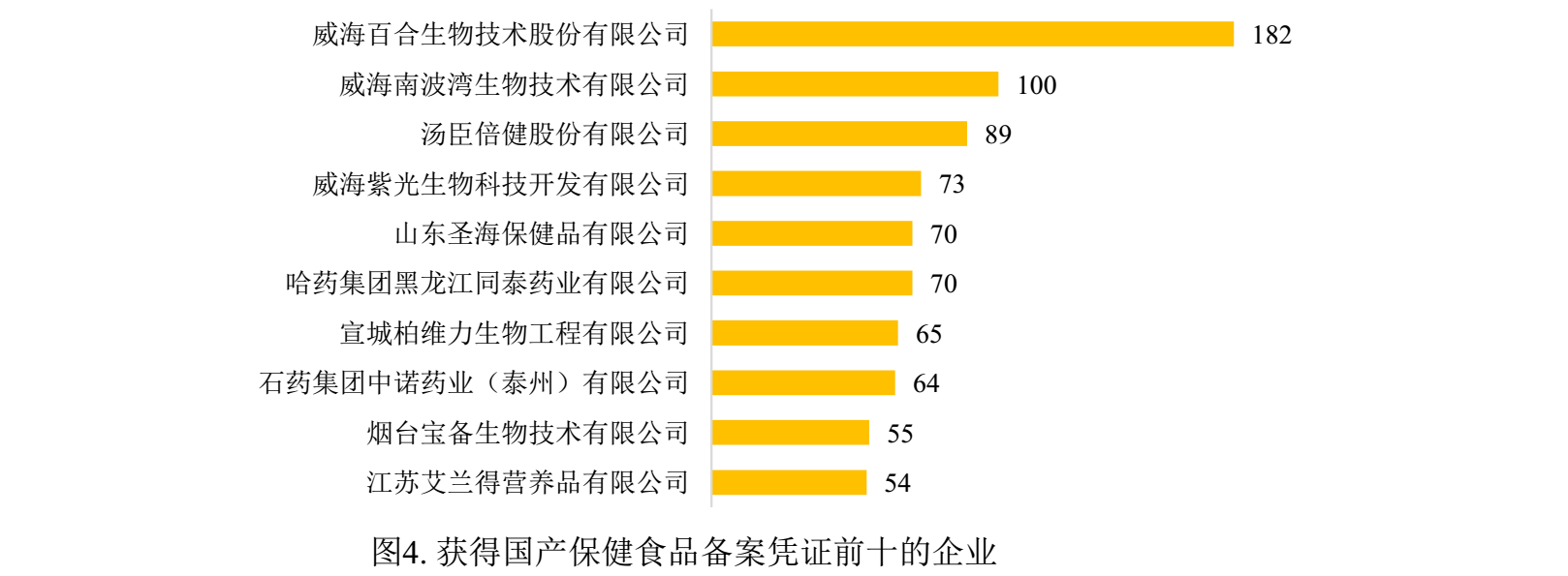 已备案的国产保健食品分别来自363家企业。其中威海百合生物技术股份有限公司共182款保健食品获得备案凭证,备案数量最多;威海南波湾生物技术有限公司共100款保健食品获得备案凭证,备案数量位居次席;汤臣倍健股份有限公司有89款保健食品获得备案凭证,位居第三。