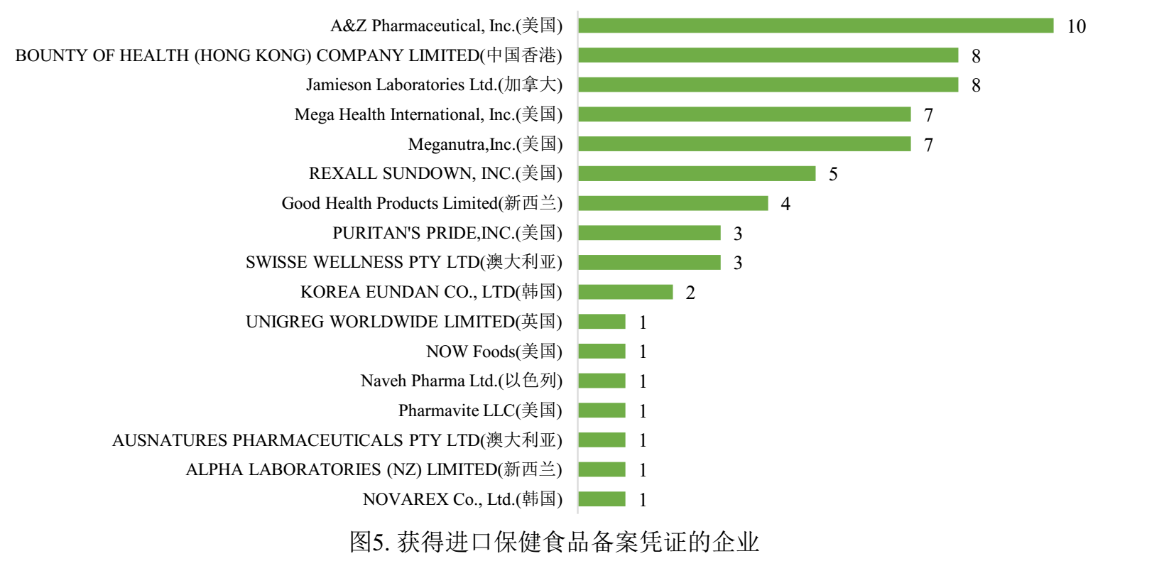 已备案的进口保健食品分别来自17家企业,其中,A&Z Pharmaceutical, Inc.(美国安士制药有限公司)共10款保健食品获得备案凭证,备案数量最多;BOUNTY OF HEALTH (HONG KONG) COMPANY LIMITED(健之宝(香港)有限公司)和Jamieson Laboratories Ltd.(健美生实验室有限公司)分别获得8款保健食品备案凭证,备案数量位居次席;Mega Health International, Inc.(美格健康国际有限公司)和Meganutra,Inc.(美国美格乐特生物有限公司)分别获得7款保健食品备案凭证,备案数量位居第三。