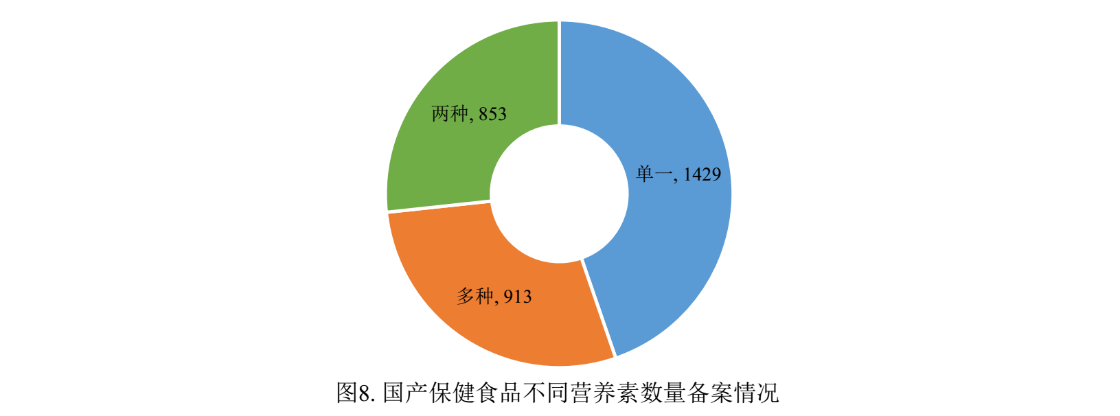 已备案的国产保健食品中补充单一营养素的产品最多,备案数量为1429款,其次为补充多种营养素和补充两种营养素的产品。