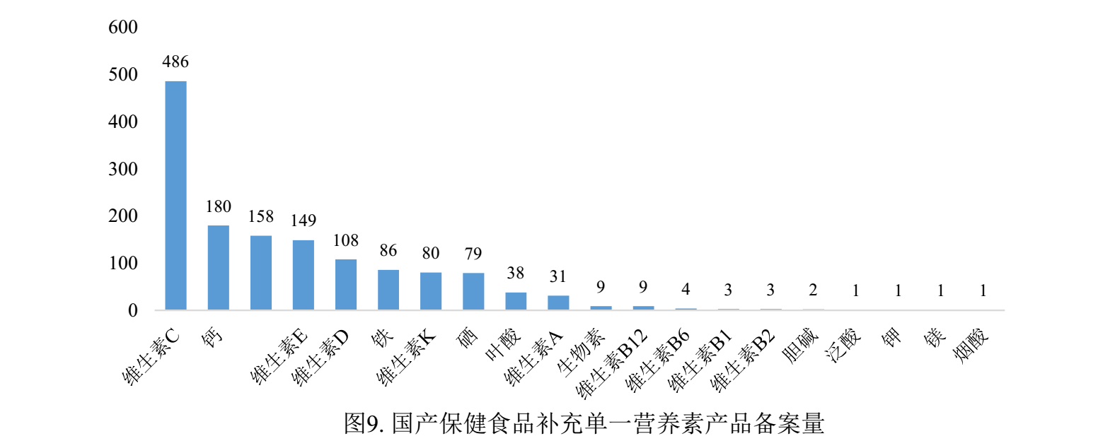 国产备案产品中补充多种维生素矿物质的产品、补充维生素C的产品和补充钙和维生素D的产品为三大主流产品,备案数量分别为531款、486款和314款。