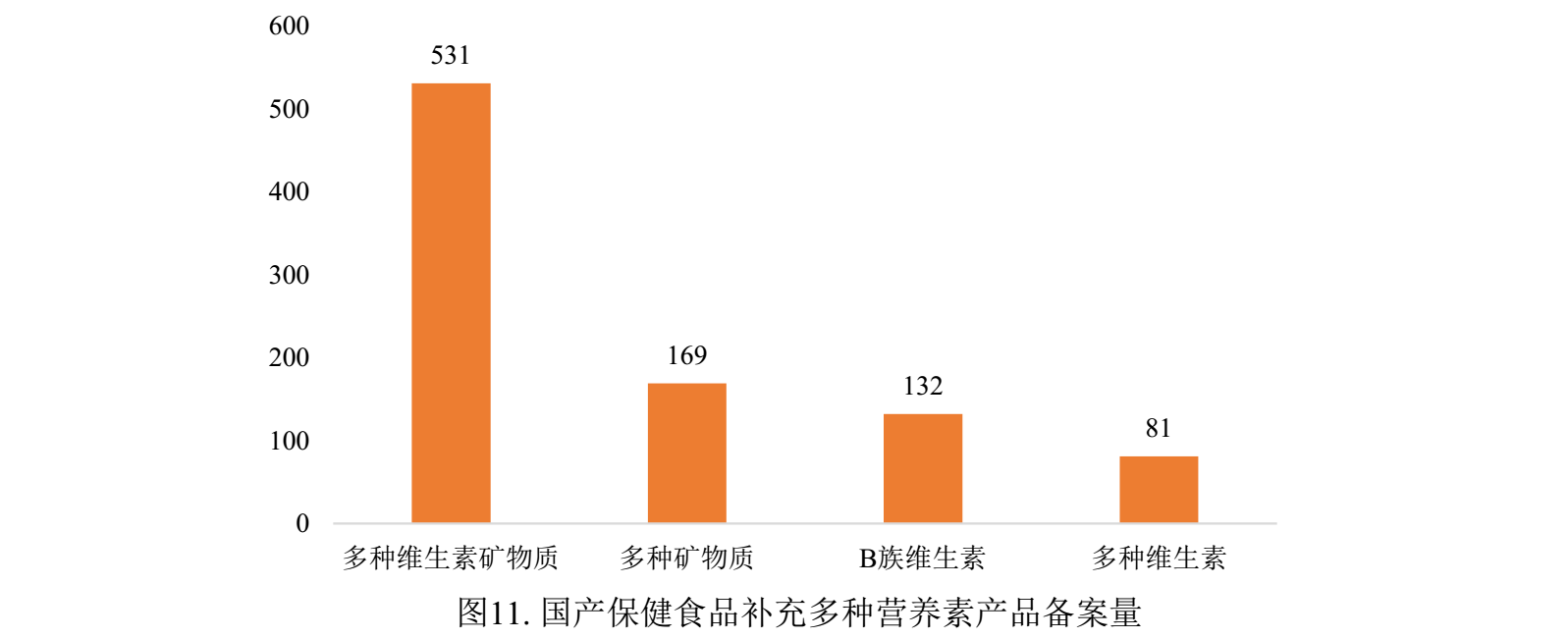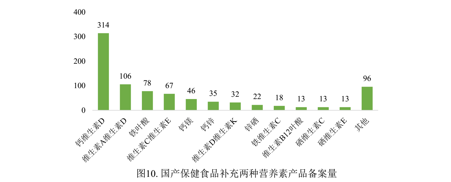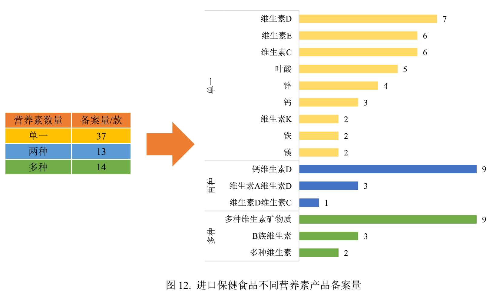 已备案进口保健食品中补充多种维生素矿物质的产品、补充钙和维生素D的产品和补充维生素D的产品为三大主流产品,备案量分别为9款、9款和7款。