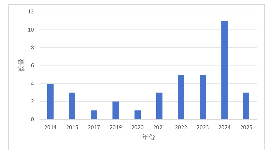 图1. 2014年-2025年中国新饲料添加剂批准数量(按年份)