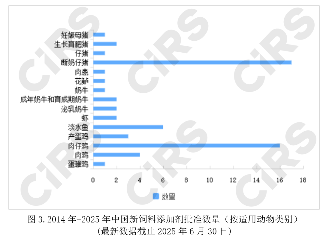 2014年-2025年中国新饲料添加剂批准数量(按适用动物类别)