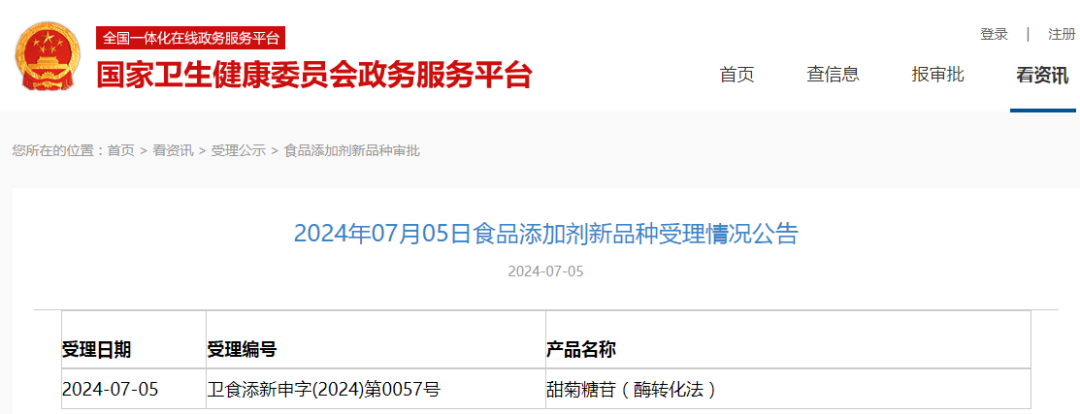 - 新增1款食品添加剂新品种受理(甜菊糖苷(酶转化法))