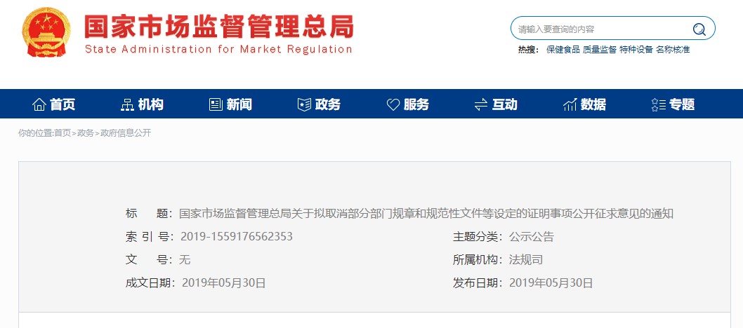 5月30日,国家市场监管总局发布《市场监管总局关于取消部分部门规章和规范性文件等设定的证明事项的决定(征求意见稿)》向公众征求意见,拟取消部门规章设定的证明事项32项,部门规范性文件等设定的证明事项72项。意见反馈截止日期为2019年6月29日。