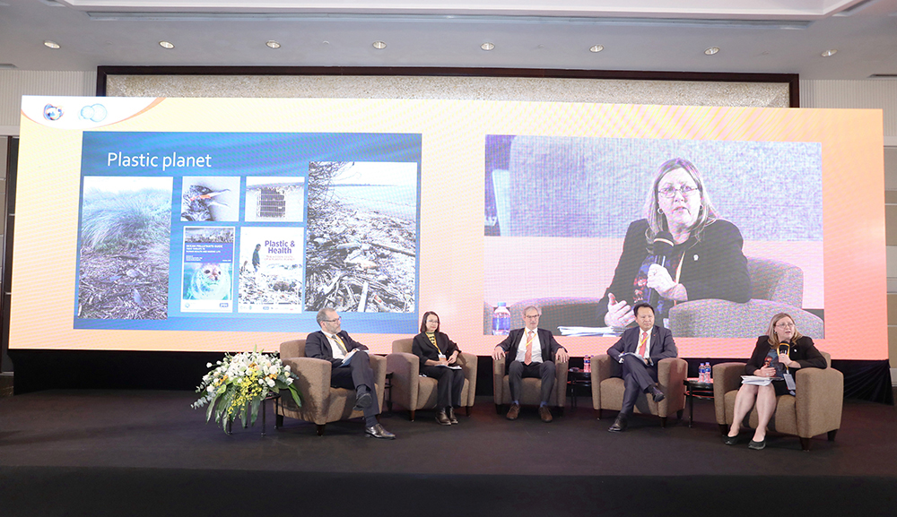 联合国环境规划署经济部 (UNEP) Tim Kasten副总监及小组成员泰国污染控制署高级科学家Pornpimon Chareonsong,终止塑料垃圾联盟(Alliance to End Plastic Waste)Yoke Loon Lim,有机污染物联盟(IPEN)塑料顾问Jane Bremmer,欧洲化学品管理署(ECHA)部门主管Erwin Annys从塑料污染的现状及政策制定发展原则发起讨论,就如何增加循环性,减少微塑料特定使用等进行讨论并呼吁各国对可持续解决方案都需要承担起相应的责任。