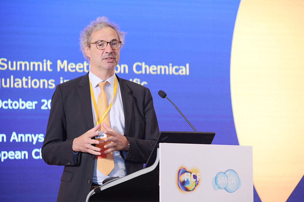 组委会代表赫尔辛基化学品论坛秘书长Geert Dancet和AICM理事会成员林育麟致开幕辞。他们表示亚洲作为全球最具潜力的化学品市场,中国已超过欧盟成为化学品的主要生产国和贸易国。化工安全与可持续发展越来越受到世界瞩目。此次峰会是赫尔辛基化学品论坛首次落地亚洲,与亚太化学品法规峰会(SMCR)结合,组成全球性的化学品法规峰会,这是化学品法规会议的“新起点”,更大范围的互通了全球化学品法规交流及各国各方探讨促进化学品发展的长效机制。