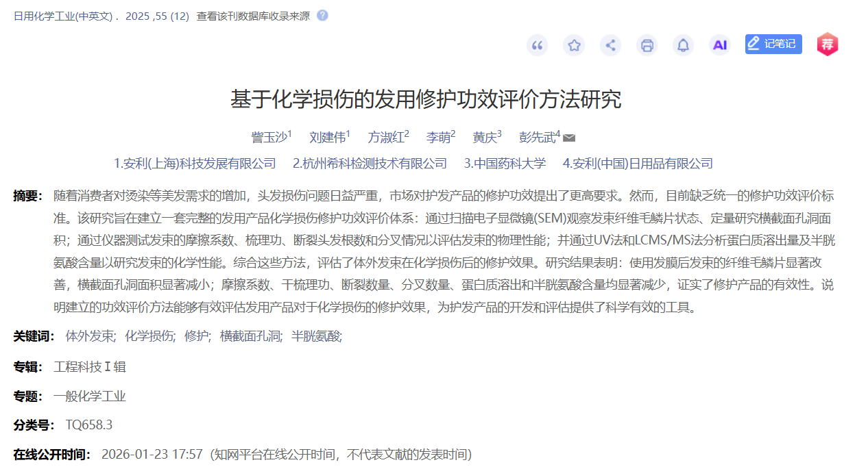 近日,杭州希科检测技术有限公司(以下简称“希科检测”,CIRS Testing)与安利(上海)科技发展有限公司(以下简称 “安利”)携手完成的“基于化学损伤的发用修护功效评价方法”取得重大进展,相关成果已正式发表于国内核心期刊《日用化学工业》。这一研究从头发显微观察、物理性质、化学组成三个维度,为基于化学损伤的发用产品修护功效评价提供了全新的科学工具。