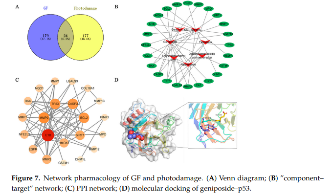 蛋白质组学与网络药理学结合:通过DIA定量蛋白组技术发现G2/M检查点等栀子抗光损伤关键靶标;运用网络药理学分析锁定TP53/IL1B/MMP9等核心靶点;创建栀子苷-p53分子对接验证,为栀子提取物抗光损伤机制研究提供多组学交叉验证范式。