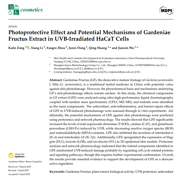 近日,杭州瑞旭科新生物技术有限公司(以下简称“科新生物”,CIRS Biotech)与上海君裕生物科技集团有限公司(以下简称“君裕集团”)联合开展的栀子提取物(Gardeniae Fructus Extract)抗皮肤光损伤研究取得突破性进展。该项研究成果已发表于国际知名期刊《Cosmetics》(SCI收录),为抗光损伤类化妆品功效原料的研发与评价体系构建提供了重要科学依据。