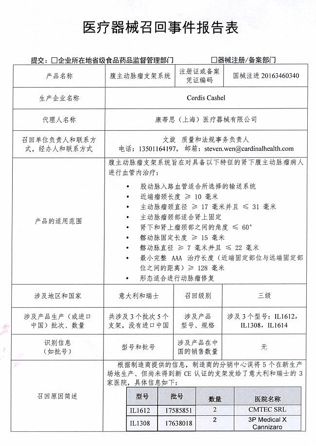 7月28日,总局发布了三个医疗器械产品主动召回的报告,分别是腹主动脉瘤支架系统、X射线计算机体层摄影设备和腹腔镜手术器械。