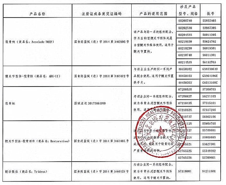 | HowmedicaOsteonics Corp. | 股骨柄等产品 | 产品内部和外部吸塑包装处可能存在缺口 | 见附件 | 三级 |