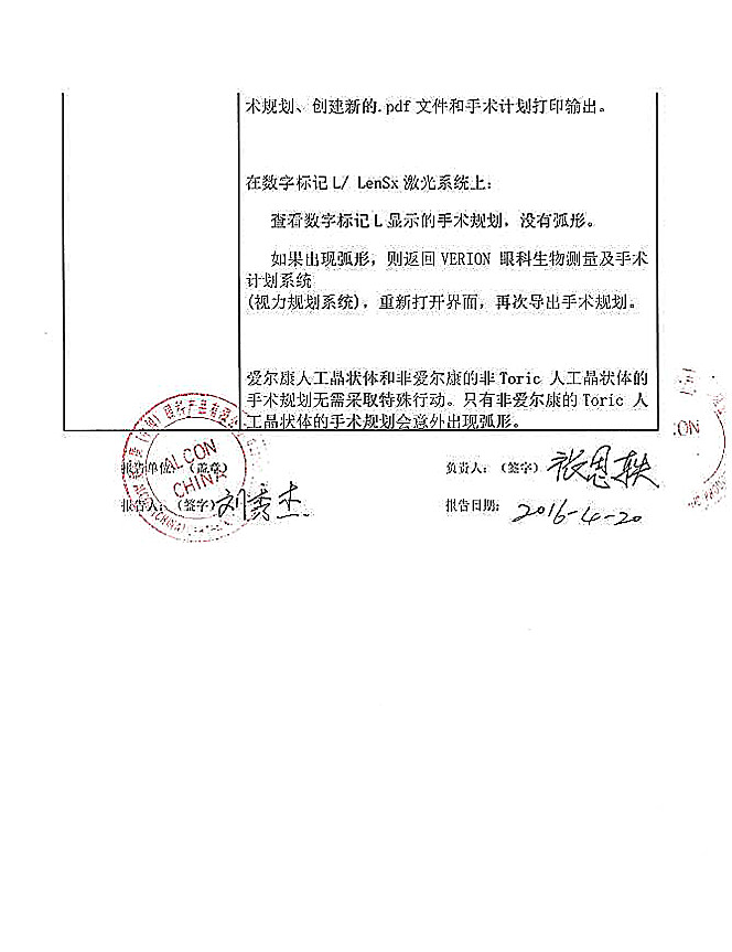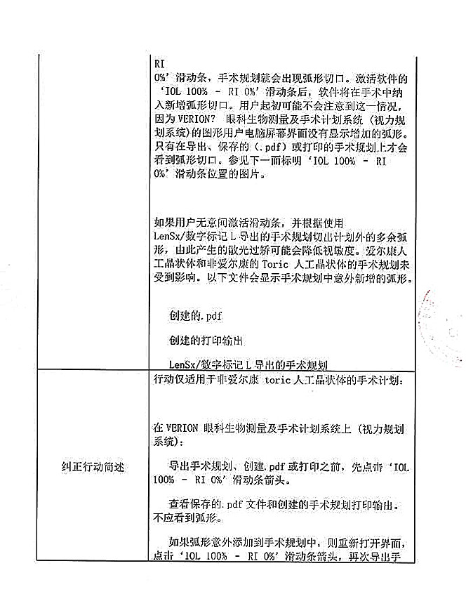 爱尔康(中国)眼科产品有限公司 报告,由于在打印、已保存的(.pdf)或导出的手术规划上出现手术规划外的意外弧形切口等原因,Alcon GPS -WaveLight GmbH 对其生产的 VERION眼科生物测量及手术计划系统(视力规划系统)(注册或备案号:国械注进20143226003)主动召回。召回级别为三级。涉及产品的型号、规格及批次等详细信息见《医疗器械召回事件报告表》。