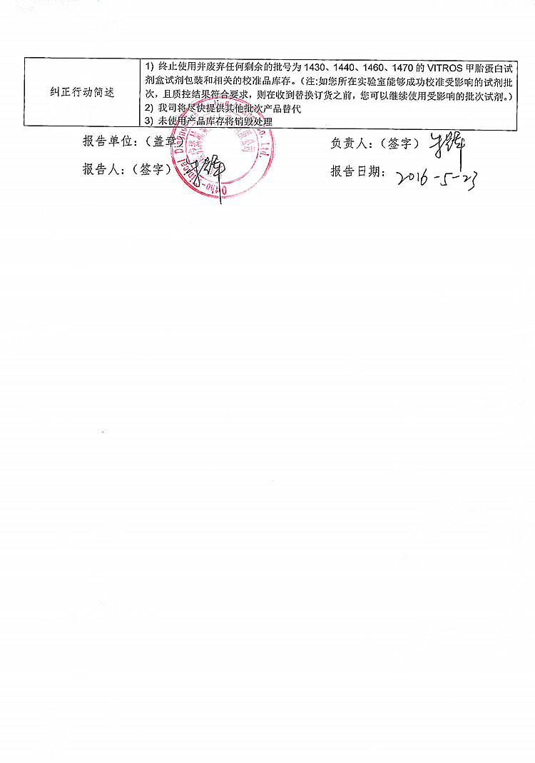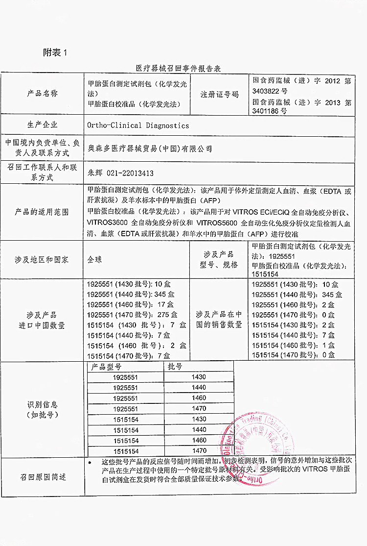 奥森多医疗器械贸易(中国)有限公司报告:企业发现,涉及批号产品的反应信号随时间而增加。甲胎蛋白虚假升高具有中期或长期风险,可能导致治疗错误。初步检测表明,信号意外增加与这些批次产品在生产过程中使用的一个特定批号原材料有关。公司决定召回相关产品,本次召回级别II级,涉及产品的型号、规格及批次等详细信息见《医疗器械召回事件报告表》。