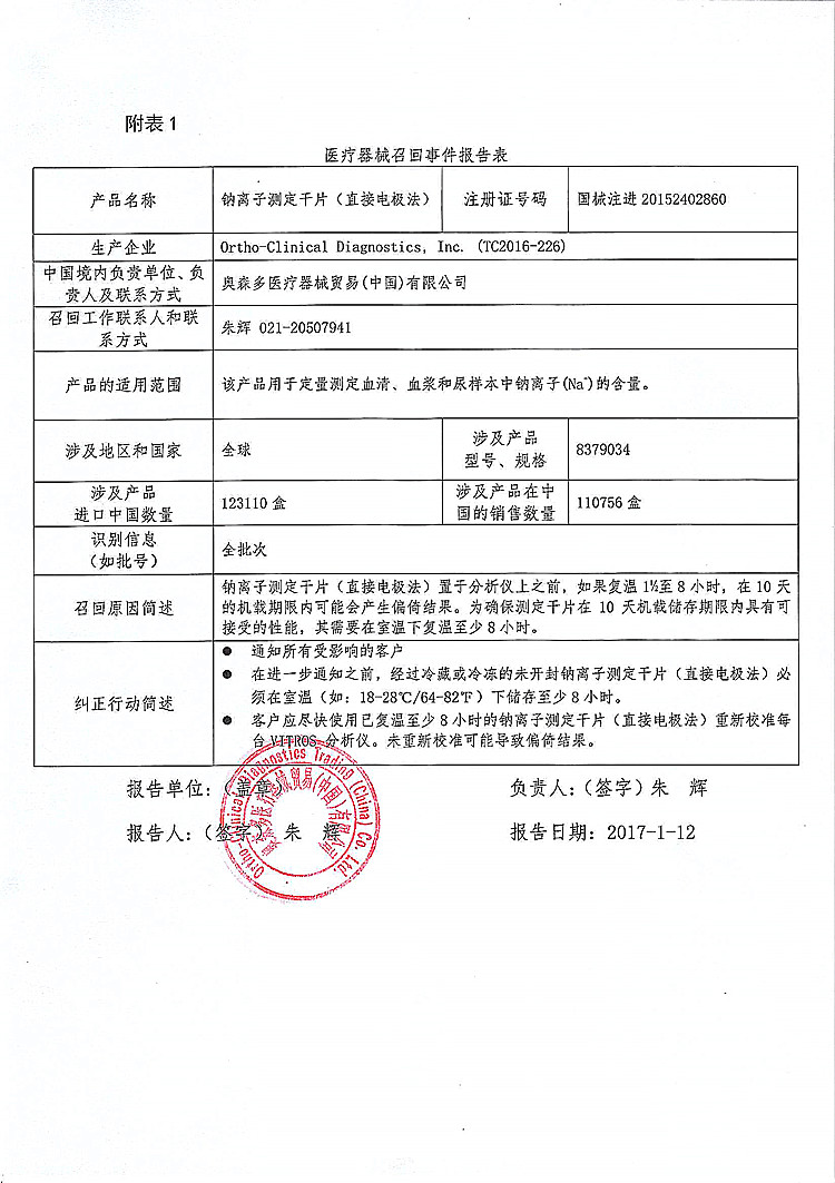 奥森多医疗器械贸易(中国)有限公司对钠离子测定干片(直接电极法)主动召回