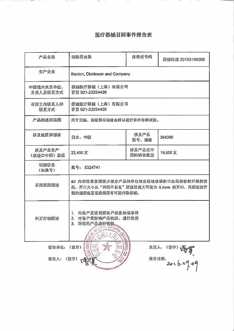 碧迪医疗器械(上海)有限公司对动脉采血器主动召回