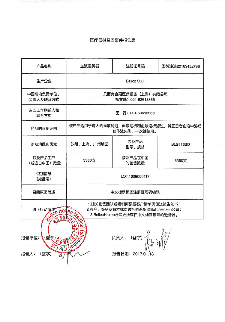 贝而克合翔医疗设备(上海)有限公司对血液透析器主动召回