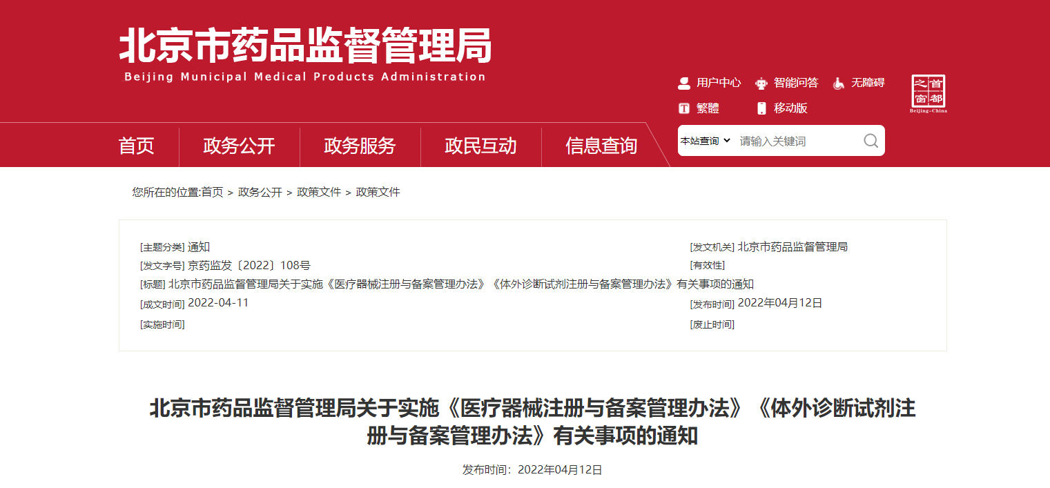 本通知自发布之日起实施。《北京市食品药品监督管理局关于医疗器械产品注册工作有关事宜的通告》(京食药监械监〔2014〕54号)同时废止。