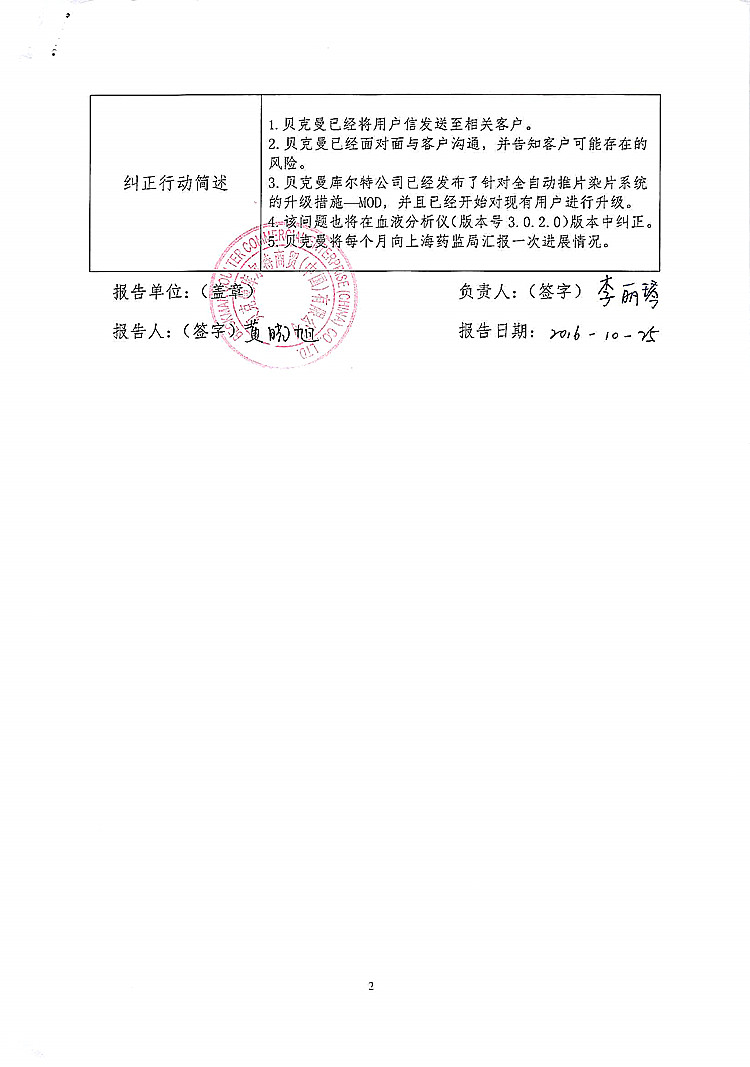 贝克曼库尔特商贸(中国)有限公司对全自动推片染片系统、血液分析仪主动召回