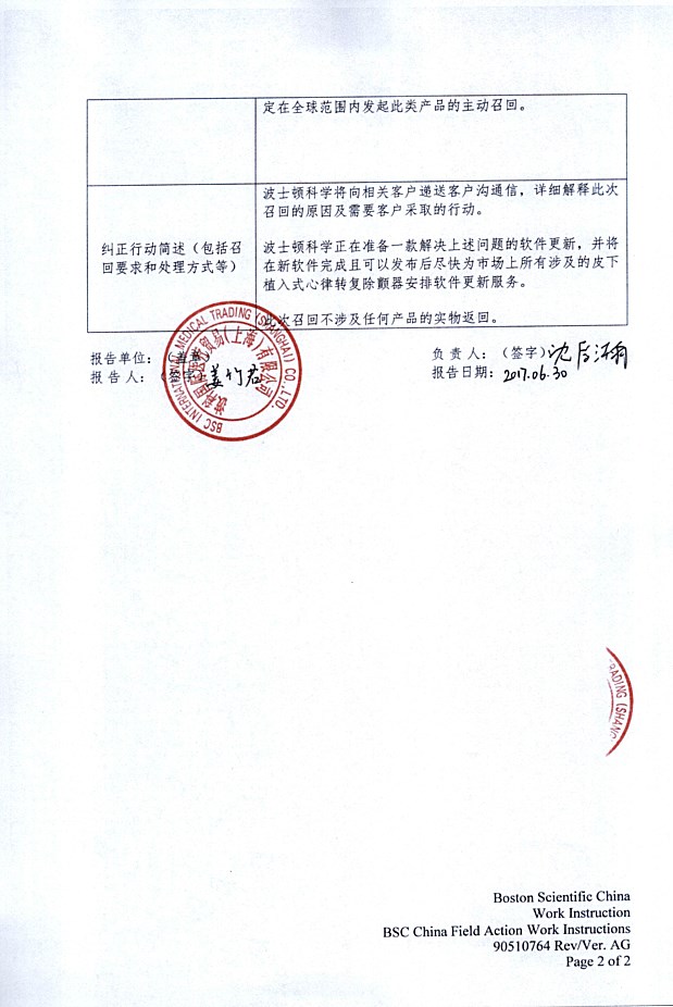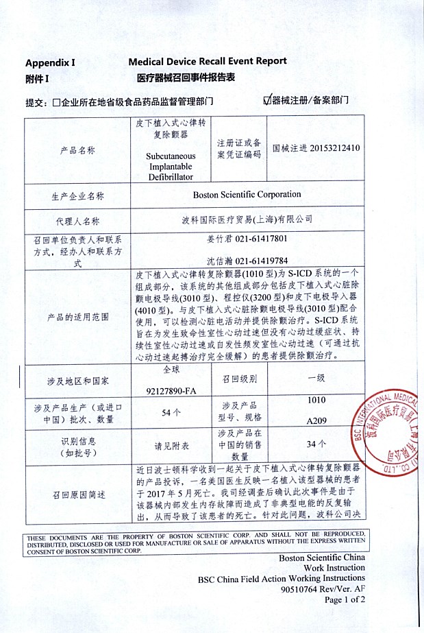 波科国际医疗贸易(上海)有限公司报告,由于该公司代理的皮下植入式心律转复除颤器内部发生内存故障而造成非典型电能的反复输出,导致美国一名植入该产品的患者死亡,生产商Boston Scientific Corporation对其生产的皮下植入式心律转复除颤器(注册证编号:国械注进20153212410)主动召回。召回级别为一级。涉及产品的型号、规格及批次等详细信息见《医疗器械召回事件报告表》。