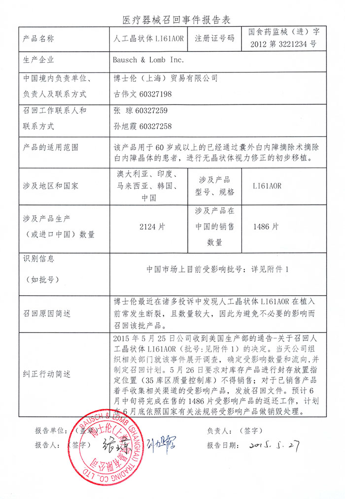 博士伦(上海)贸易有限公司对人工晶体主动召回