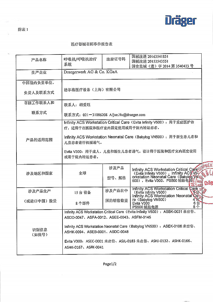 德尔格医疗设备(上海)有限公司报告:2016年2月启动呼吸机、呼吸治疗系统选配PS500辅助电源召回措施后,电池缺陷问题仍然需要进一步完善。公司决定再次召回相关产品,本次召回级别I级,涉及产品的型号、规格及批次等详细信息见《医疗器械召回事件报告表》。