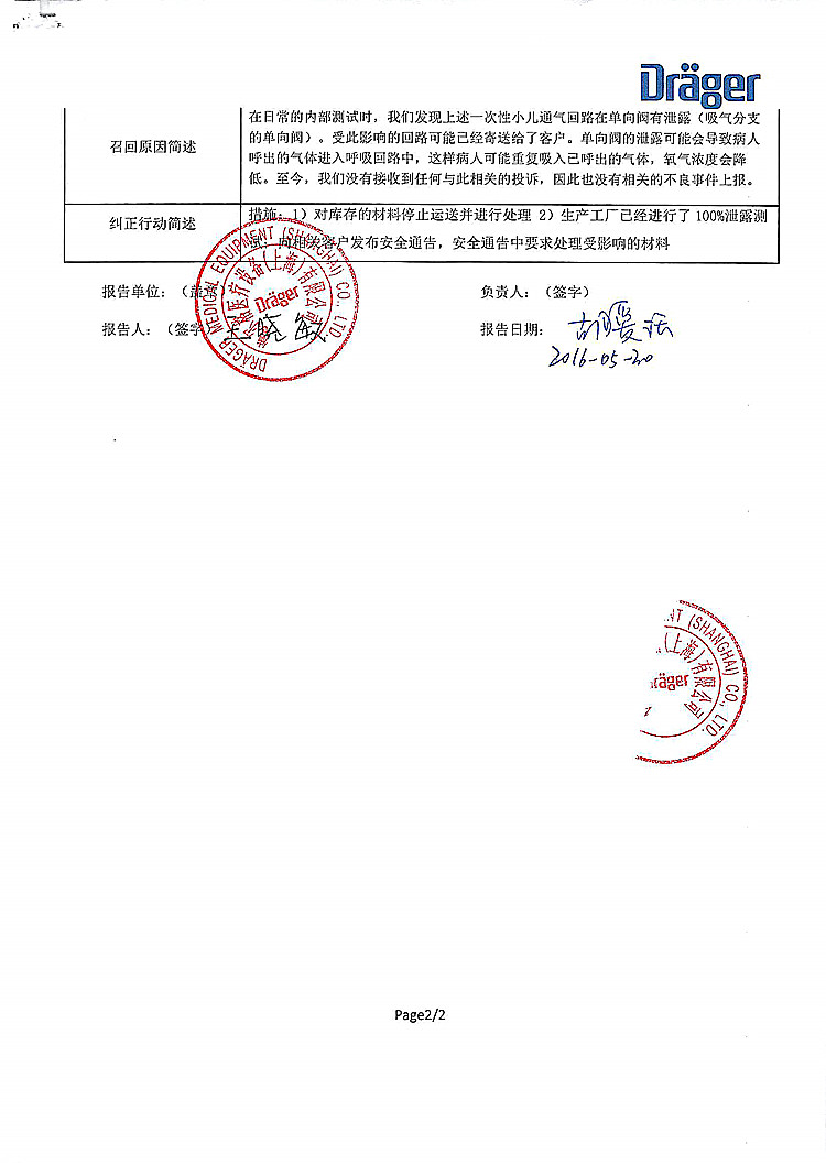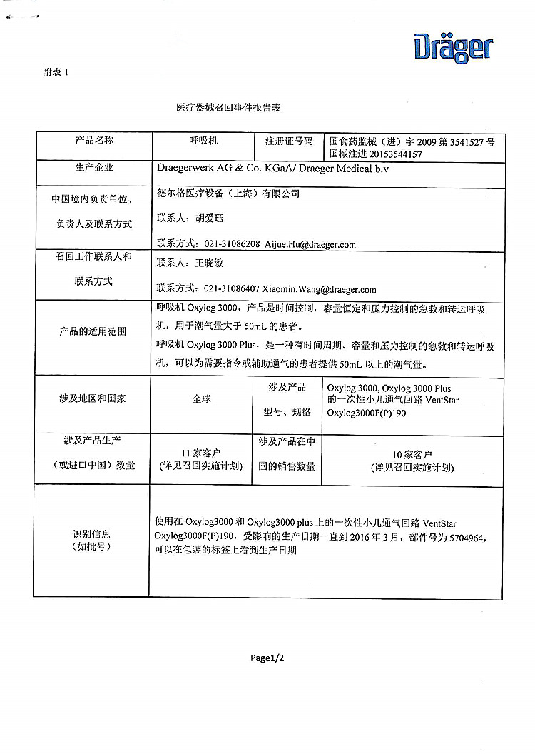 德尔格医疗设备(上海)有限公司对呼吸机主动召回