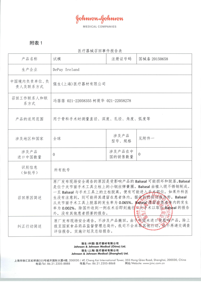 强生(上海)医疗器材有限公司报告,该公司代理的试模 Trial (备案号:国械备20150658),由于产品的部分弹簧圈可能损坏和脱落,其生产商DePuy Ireland公司对该产品进行主动召回。该公司称本次召回产品未在中国销售。请各省、自治区、直辖市食品药品监督管理局加强对此类产品的监督管理。