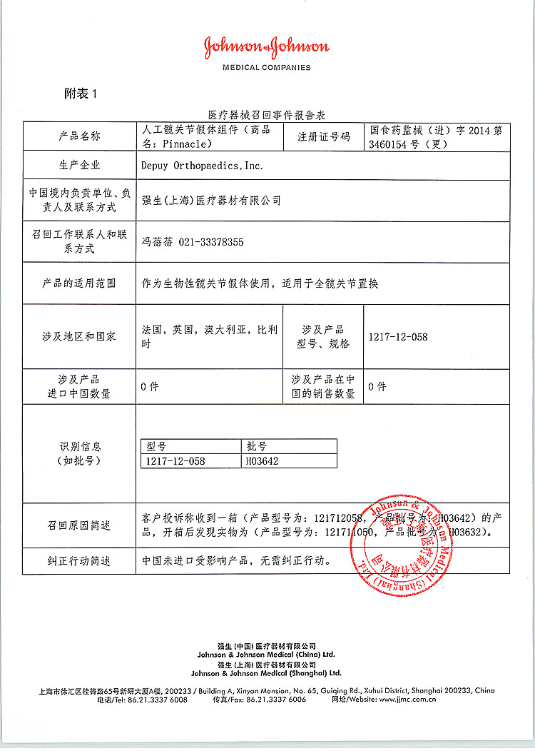 强生(上海)医疗器材有限公司报告,该公司代理的人工髋关节假体组件 (商品名:Pinnacle)(注册证编号:国食药监械(进)字2014第3460154号(更)),发现客户投诉称收到一箱(产品型号为:121712058,产品批号为:H03642)的产品,开箱后发现实物为(产品型号:121711050,产品批号为:H03632),其生产商DePuy Orthopaedics, Inc.对该产品进行主动召回。该公司称本次召回产品未在中国销售。请各省、自治区、直辖市食品药品监督管理局加强对此类产品的监督管理。