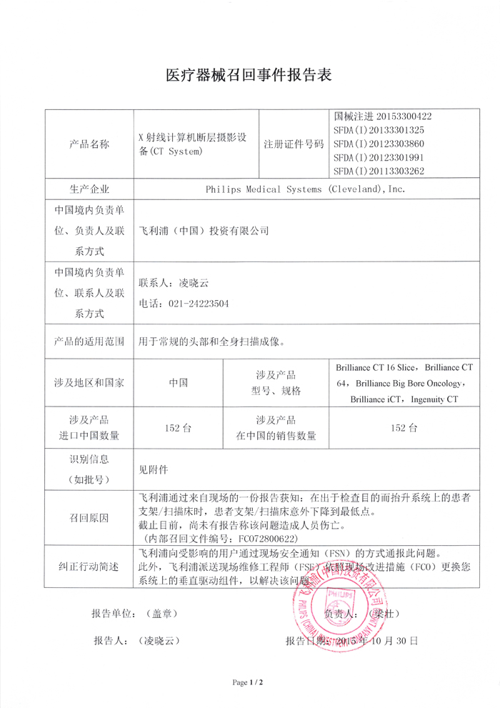 飞利浦(中国)投资有限公司对X射线计算机断层摄影设备(CT System)主动召回