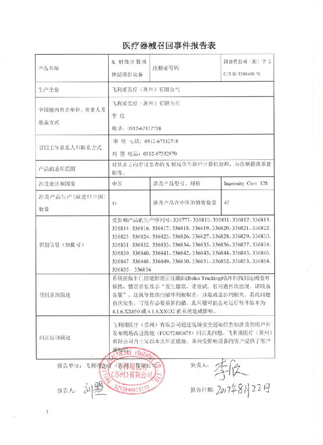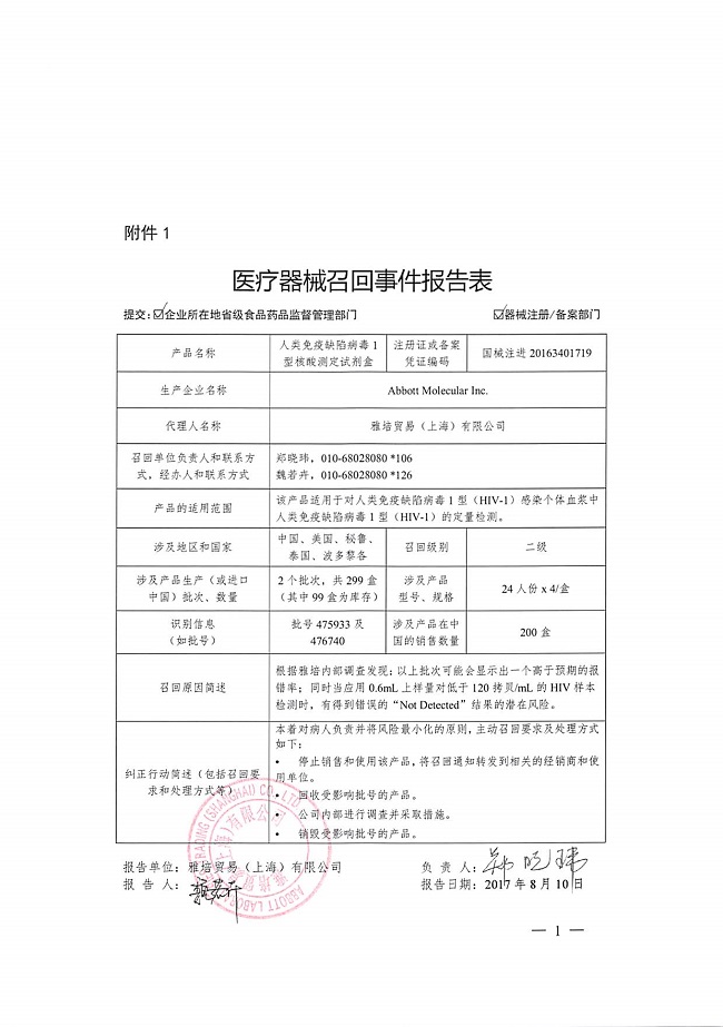 9月4号,飞利浦医疗(苏州)有限公司报告,由于系统报错的原因,对其生产的X射线计算机体层摄影设备召回。9月7号雅培贸易(上海)有限公司报告,涉及产品可能会产生非预期的错误代码和报错率,对人类免疫缺陷病毒1型核酸测定试剂盒主动召回。