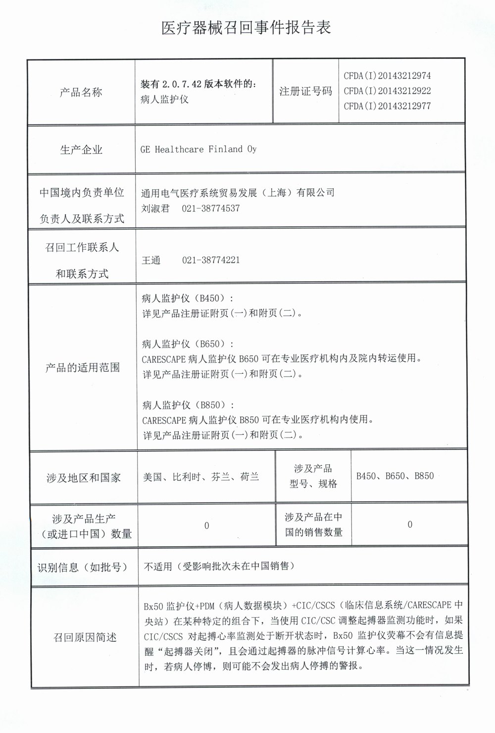 通用电气医疗系统贸易发展(上海)有限公司报告,该公司代理的型号为B450、B650、B850的病人监护仪(注册证号:国食药监械(进)字2014第3212974号、国食药监械(进)字2014第3212922号、国食药监械(进)字2014第3212977号),由于可能存在不会发出病人停搏警报的情况,生产商GE Healthcare Finland Oy对该产品进行主动召回。该公司称本次召回产品未在中国销售。请各省、自治区、直辖市食品药品监督管理局加强对此类产品的监督管理。