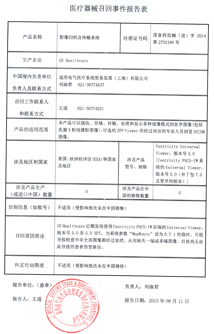通用电气医疗系统贸易发展(上海)有限公司报告,该公司代理的影像归档及传输系统[注册证号:国食药监械(进)字2014第2702186号],由于以上产品可能存在图像缺失的情况,其生产商GE Healthcare公司对该产品进行主动召回。该公司称本次召回产品未在中国销售。请各省、自治区、直辖市食品药品监督管理局加强对此类产品的监督管理。
