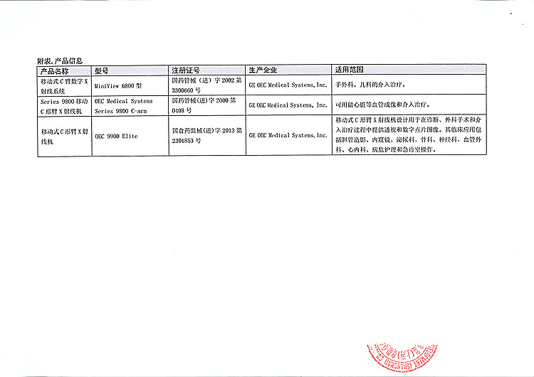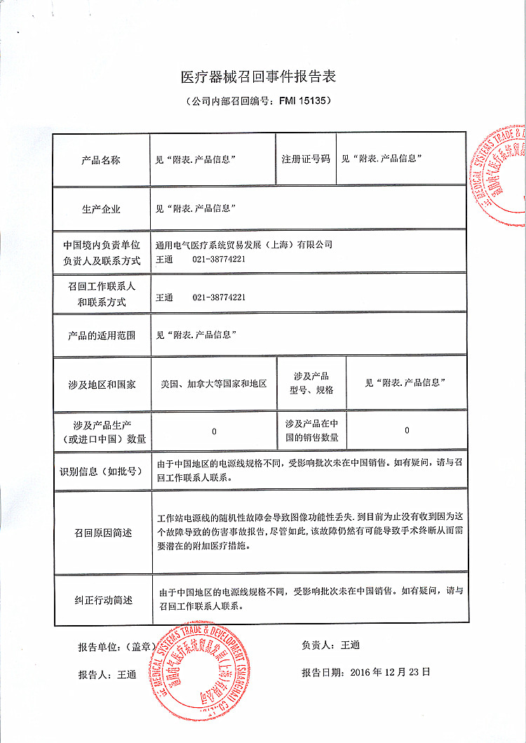 通用电气医疗系统贸易发展(上海)有限公司报告,该公司代理的移动式C臂数字X射线系统(注册证编号:国药管械(进)字2002第3300660号)、Series 9800移动C形臂X射线机(注册证编号:国药管械(进)字2000第0408号)、移动式C形臂X射线机(注册证编号:国食药监械(进)字2013第2301853号)等产品,发现工作站电源线的随机性故障会导致图像功能性丢失。其生产商GE OEC Medical Systems,Inc.对上述产品进行主动召回,该公司称本次召回产品未在中国销售。请各省、自治区、直辖市食品药品监督管理局加强对此类产品的监督管理。