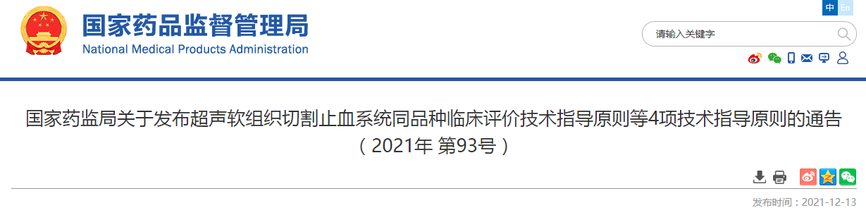 为加强医疗器械产品注册工作的监督和指导,进一步提高注册审查质量,根据《医疗器械注册与备案管理办法》(国家市场监督管理总局令第47号),国家药品监督管理局组织制定了超声软组织切割止血系统同品种临床评价技术审查指导原则等4项技术指导原则(见附件),现予发布。