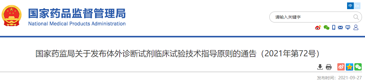 为指导体外诊断试剂临床试验工作,根据《体外诊断试剂注册与备案管理办法》(国家市场监督管理总局令第48号),国家药监局组织制定了《体外诊断试剂临床试验技术指导原则》(见附件),现予发布。该技术指导原则自发布之日起实施,原国家食品药品监督管理总局发布的《体外诊断试剂临床试验技术指导原则》(原国家食品药品监督管理总局通告2014年第16号)废止。
