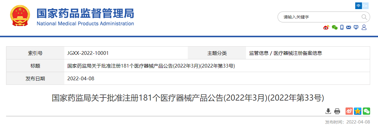 2022年3月,国家药品监督管理局共批准注册医疗器械产品181个。其中,境内第三类医疗器械产品138个,进口第三类医疗器械产品23个,进口第二类医疗器械产品18个,港澳台医疗器械产品2个(具体产品见附件)。