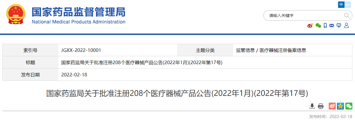 2022年1月,国家药品监督管理局共批准注册医疗器械产品208个。其中,境内第三类医疗器械产品151个,进口第三类医疗器械产品21个,进口第二类医疗器械产品33个,港澳台医疗器械产品3个(具体产品见附件)。特此公告。