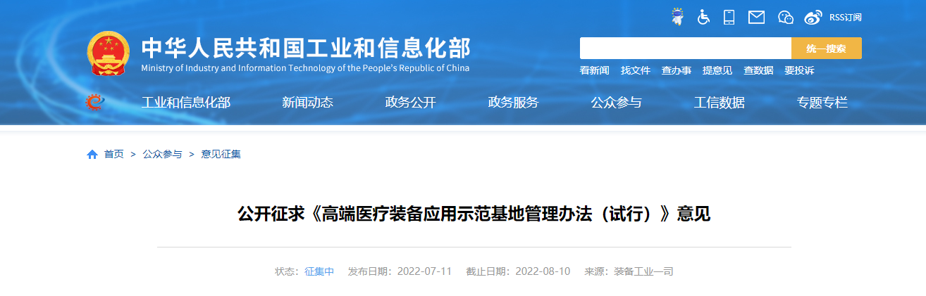为加快推进高端医疗装备发展应用,工业和信息化部、国家卫生健康委联合起草了《高端医疗装备应用示范基地管理办法(试行)》(征求意见稿),现面向社会公开征求意见。如有意见或建议,请于2022年8月10日前通过传真或电子邮件反馈。