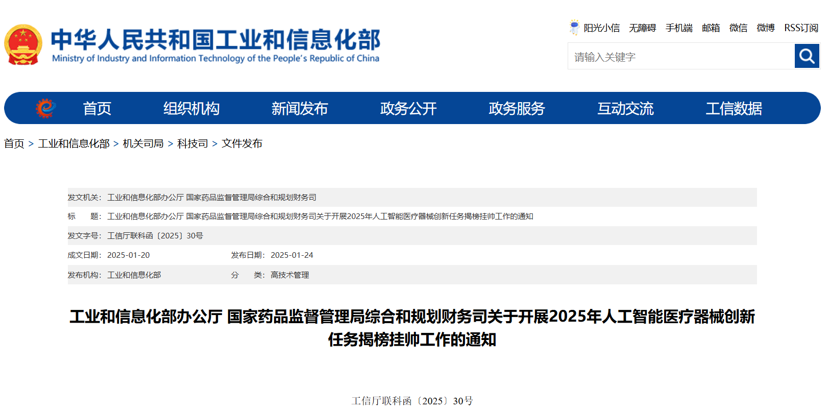 为贯彻落实习近平总书记关于人工智能发展的重要指示批示精神,推动人工智能技术与医疗器械深度融合发展,更好地服务和保障人民群众生命健康,加快形成新质生产力,工业和信息化部、国家药品监督管理局联合开展2025年人工智能医疗器械创新任务揭榜挂帅工作。有关事项通知如下: