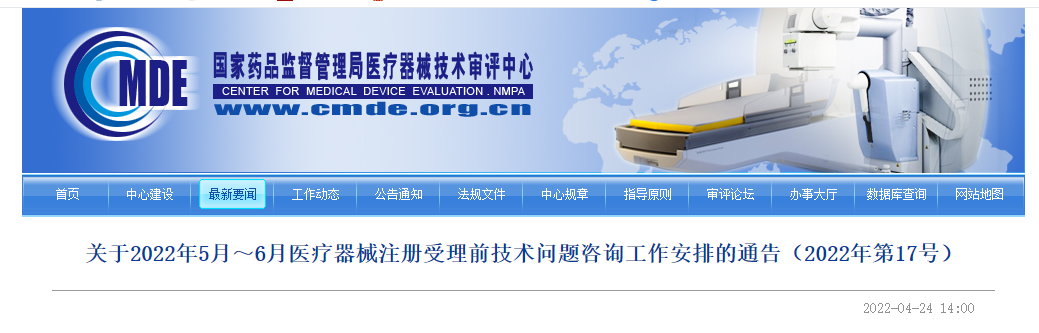 关于2022年5月~6月医疗器械注册受理前技术问题咨询工作安排的通告(2022年第17号)