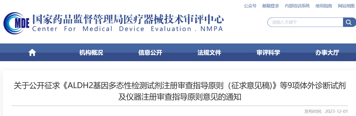 根据国家药品监督管理局2023年度医疗器械注册审查指导原则制修订计划的有关要求,我中心组织编制了《ALDH2基因多态性检测试剂注册审查指导原则(征求意见稿)》等9项体外诊断试剂及仪器注册审查指导原则(附件1-9),现向社会公开征求意见。