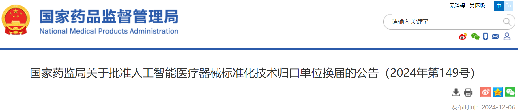国家药监局批准人工智能医疗器械标准化技术归口单位换届(组成方案见附件),现予公布。