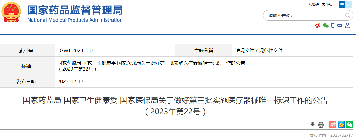 2021年1月1日,9大类69种第三类医疗器械第一批实施医疗器械唯一标识。2022年6月1日,其他第三类医疗器械(含体外诊断试剂)第二批实施医疗器械唯一标识。为进一步贯彻落实《医疗器械监督管理条例》《国务院办公厅关于印发治理高值医用耗材改革方案的通知》和国务院深化医药卫生体制改革有关重点工作任务,决定将部分第二类医疗器械作为第三批品种实施医疗器械唯一标识,现就有关事项公告如下:
