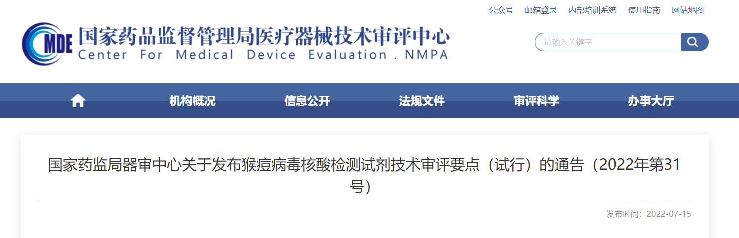 为规范猴痘病毒核酸检测试剂技术审评工作,国家药监局器审中心组织编写了《猴痘病毒核酸检测试剂技术审评要点(试行)》,现予发布。