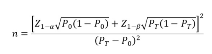 公式中,n为样本量;Z1-α、Z1-β为显著性水平和把握度的标准正态分布的分数位,P0为评价指标的临床可接受标准,PT为试验体外诊断试剂评价指标预期值。