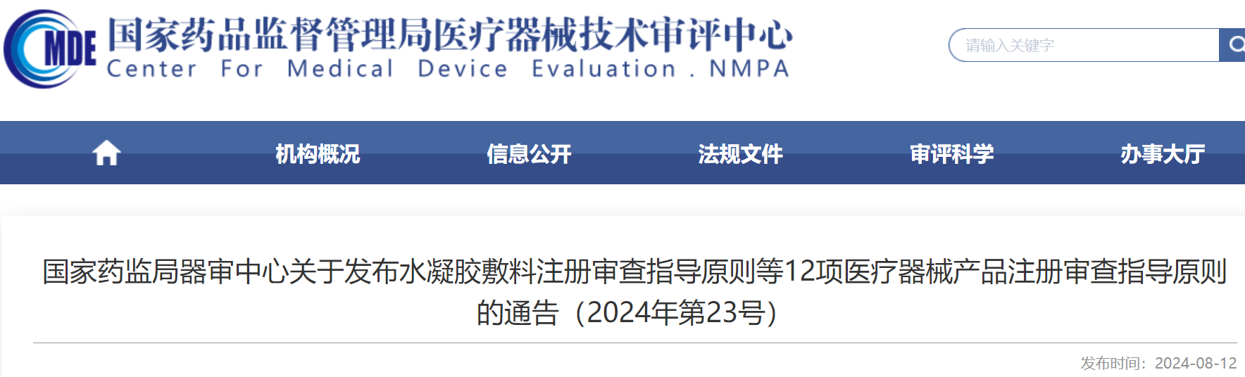 【CMDE】国家药监局器审中心关于发布水凝胶敷料注册审查指导原则等12项医疗器械产品注册审查指导原则的通告(2024年第23号)