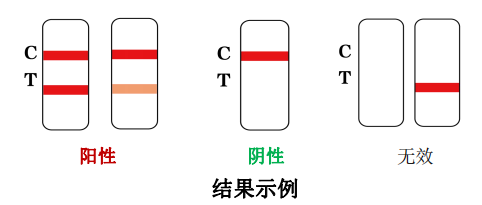 阳性:两条红色或紫色条带出现。一条位于检测区(T)内,另一条位于质控区(C)内。检测区(T)条带颜色可深可浅,均为阳性结果。