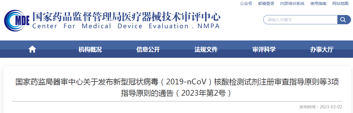 【CMDE】国家药监局器审中心关于发布新型冠状病毒(2019-nCoV)核酸检测试剂注册审查指导原则等3项指导原则的通告(2023年第2号)
