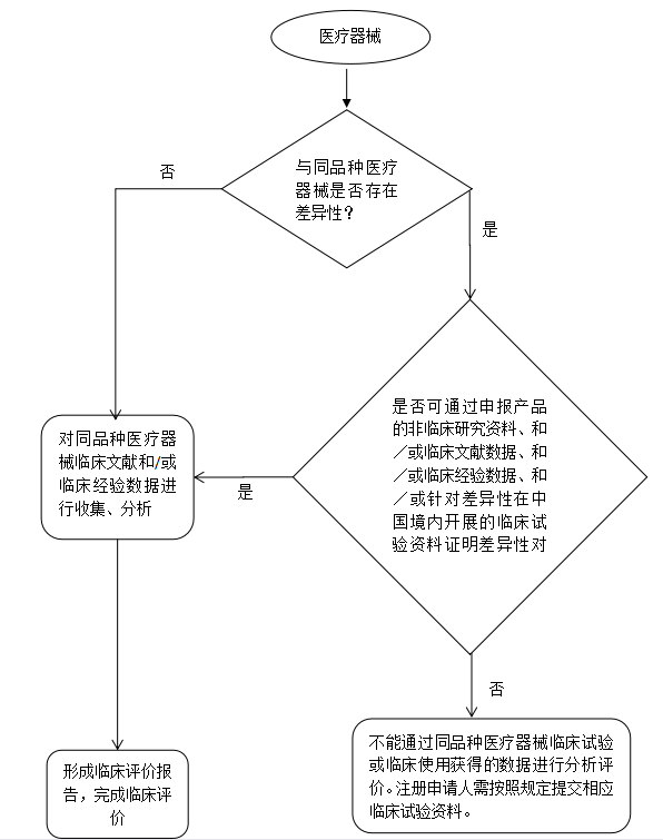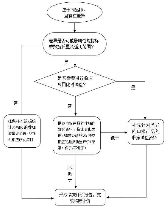 根据《医疗器械临床评价技术指导原则》中规定的评价路径可知,拟申报产品与对比产品关系有两种,或为同品种产品,或为非同品种产品,如为同品种产品,还需对两者之间的差异是否对产品安全性、有效性产生不利影响进行进一步评价。